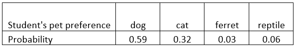 In one of Mrs. Boyd's prob/stats classes, students were asked to decide which pet preference they had out of the following 4 options. The distributed probabilities for the students preference in the class are described below.