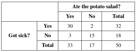 After a company picnic a large portion of the employees called off sick the next day. Management began to wonder if the employees got food poisoning from the potato salad that was at the picnic. They selected a random sample of 50 employees and asked them if they ate the potato salad and if they got sick. Here are the results: