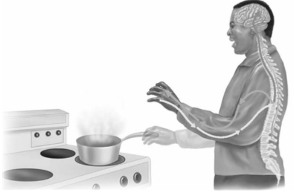 Nerve signals travel from your spinal cord to your arm muscles and you pull your hand away.