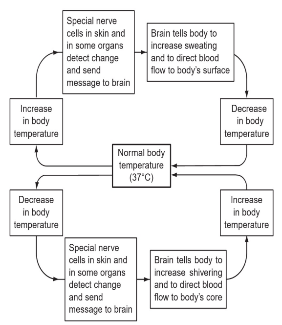 Humans are warm-blooded organisms that maintain a constant body temperature of around 37°C (98.6°F). The diagram shows the changes that take place to keep the human body temperature constant.