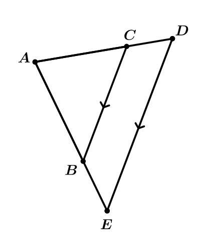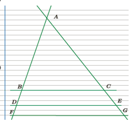 Draw two intersecting transversals on a sheet of lined paper, as in the following diagram. Label the point of intersection of the transversals A. Select any two of the horizontal lines to form the third side of two different triangles. Label the endpoints of the third side of the smaller triangle B and C, and the endpoints of the third side of the larger triangle D and E.