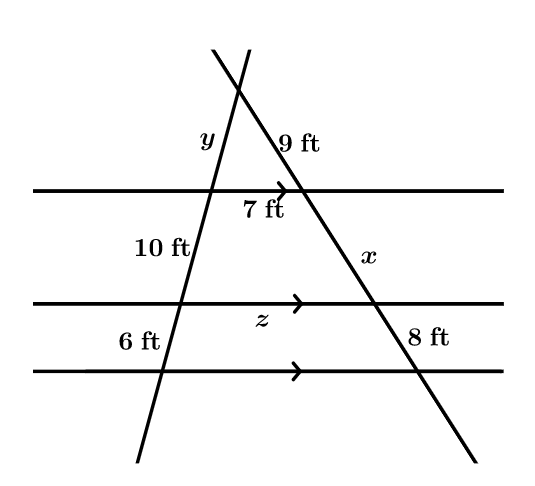 Jack y Diane están diseñando un enrejado para algunas plantas especiales que planean poner en el jardín de su patio trasero. Utilice los valores proporcionados en el esquema del diagrama de Trellis para encontrar los valores que faltan para x, y y z. Redondea tu respuesta a dos cifras decimales.
