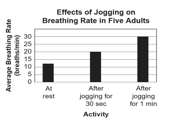 Students are gathering evidence to demonstrate that body systems work together. They measure the number of breaths per minute of five adults during three different activities: at rest, after jogging for thirty seconds, and after jogging for one minute.
