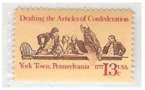 The postage stamp below shows a committee of the Second Continental Congress drafting the Articles of the Confederation.