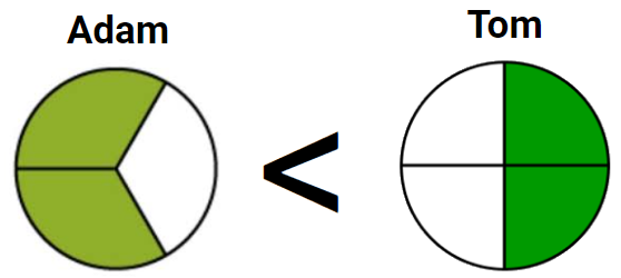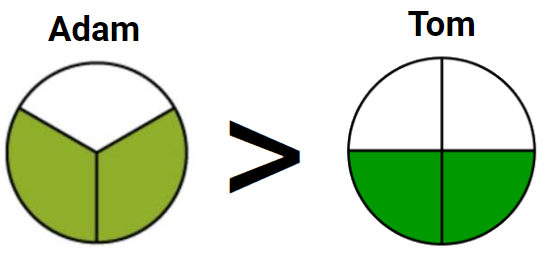 Adam ate 2/3 of a pizza. Tom ate 2/4 of the same size pizza. Which model and statement about the fractions of pizza they ate is true?