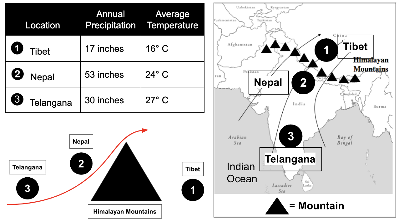 Why does Tibet receive less rainfall than Nepal? Include evidence from the map or the table to support your answer. (5 pts)