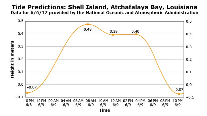 For this day at Shell Island, in the Gulf of Mexico, the tides are predicted to reach__________ at high tide, and__________ as compared to sea level at low tide. This represents a total change in water level of__________. Tide tables are printed annually for the entire year. The reason tides can be predicted so far in advance is because of known factors affecting the ocean water, such as __________. However, the actual tides on any given day may vary from the predictions. This is due to unpredictable factors, such as __________.