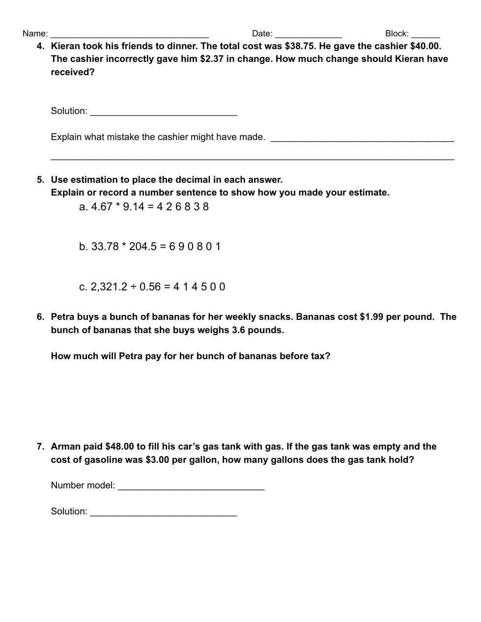 Use estimation to place the decimal in each answer. 4.67 * 9.14 = 4 2 6 8 3 8
