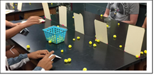 The students on the receiving end will ignore all the puffballs except the ones that land on the table. If a puffball lands on the table, the students will try to flick it through the file folders to the other side. If it makes it, they do nothing. If it does not and bounces off the file folder, the student must place it in the cup.
