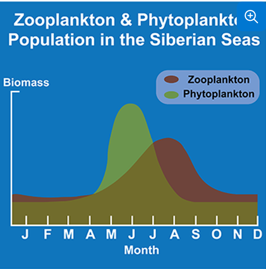 Which of the following describes factors that may contribute to annual variations in phytoplankton population in the Siberian Seas? Use what you know of the properties of ocean water, as well as the Plankton Distribution graph below.