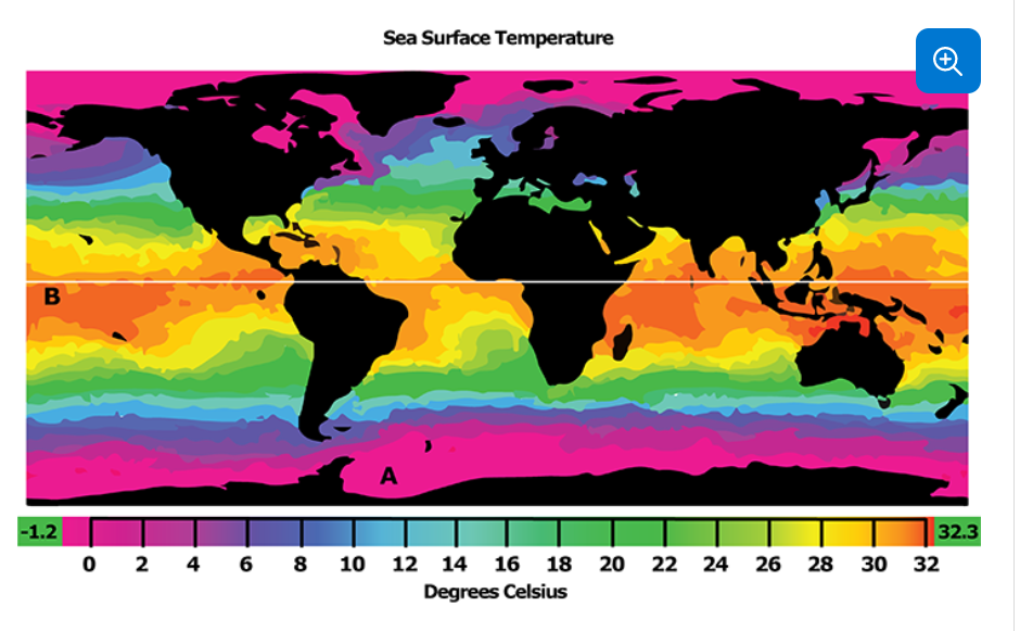 The properties of ocean water vary greatly with latitude, partly because of differences in water temperature. Compare Regions A and B in the figure by connecting each description of the sea surface to the appropriate area.