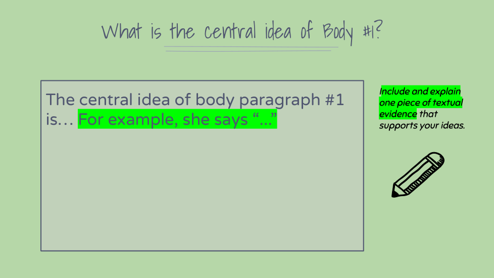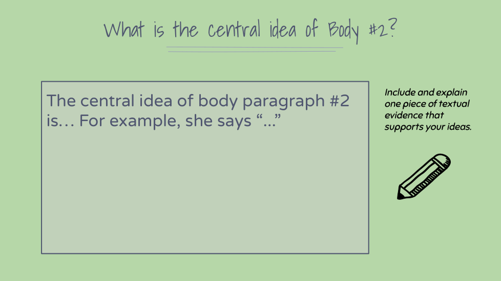 What is the central idea of Body #1? Include and explain ONE piece of textual evidence that supports your ideas.