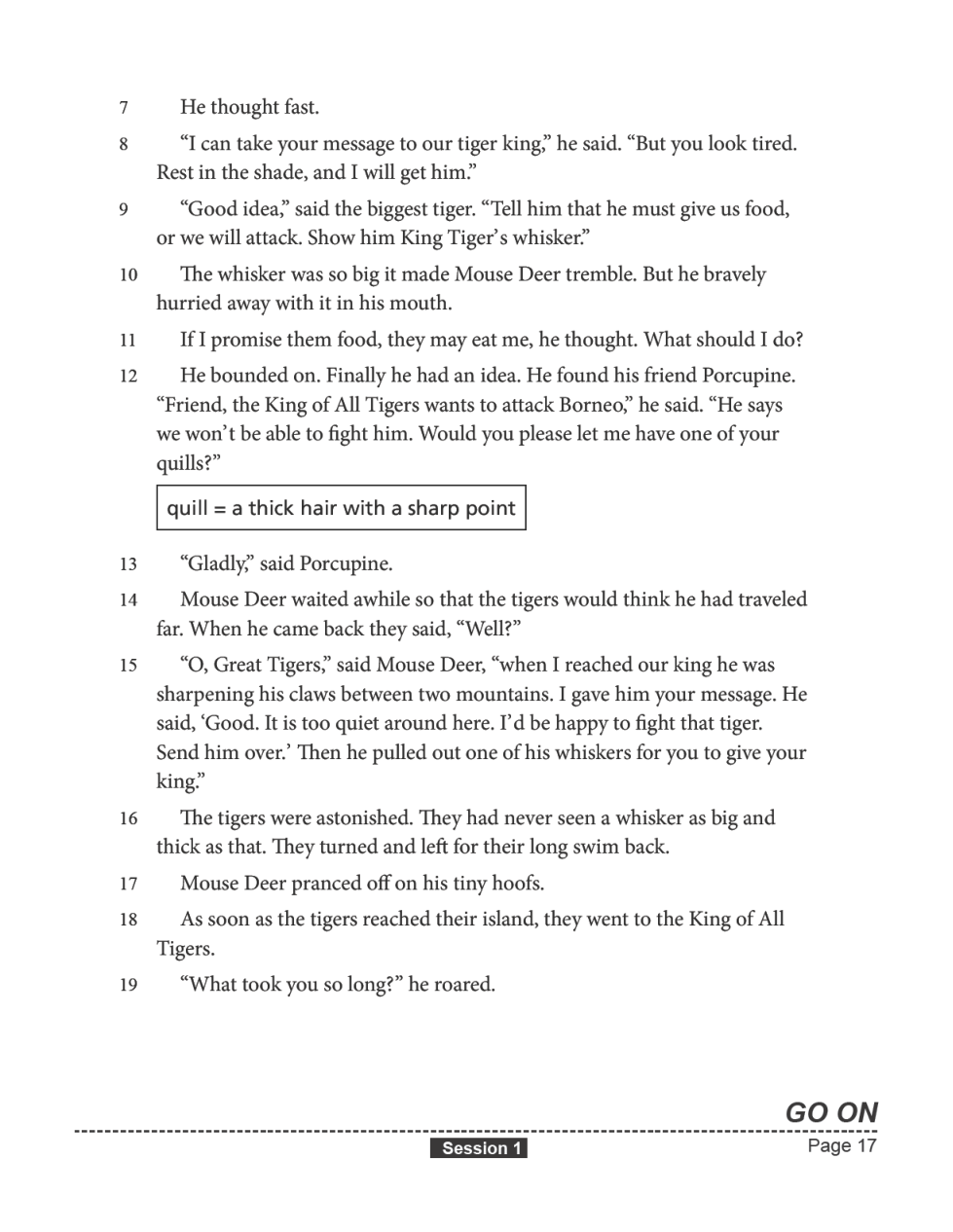 In paragraph 17, the phrase "pranced off" shows that Mouse Deer feels