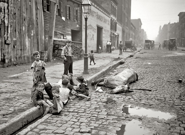 "Without dependable trash collection, people dumped their garbage on the streets. Since garbage was picked up infrequently, people sometimes dumped it into the air shafts, where it attracted vermin. To keep out the stench, residents nailed windows shut." | arrow_right_alt | |