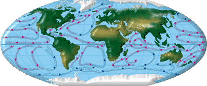 Ocean currents can be warm or cold. In general, warm currents originate at or near the equator. Cold currents originate at or near the poles. Warm currents flow away from the equator and cool currents flow towards the equator. Warm and cold currents can flow into each other forming ocean systems called a gyre.