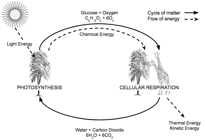 Make sure to describe the role of photosynthesis and cellular respiration in your answer.