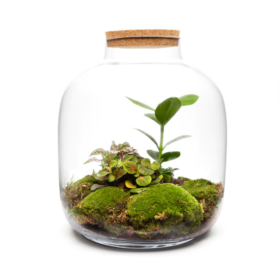 A closed terrarium is a container in which a plant lives and grows in its own micro-ecosystem. After it is first set up and put in a sunny location, it can live for many years without the need to add more water or nutrients.