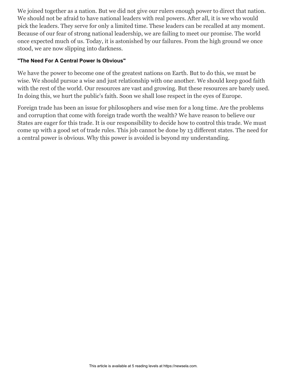 "We joined together as a nation. But we did not give our rulers enough power to direct that nation. We should not be afraid to have national leaders with real powers. After all, it is we who would pick the leaders. They serve for only a limited time. These leaders can be recalled at any moment. Because of our fear of strong national leadership, we are failing to meet our promise. The world once expected much of us. Today, it is astonished by our failures. From the high ground we once stood, we are now slipping into darkness."