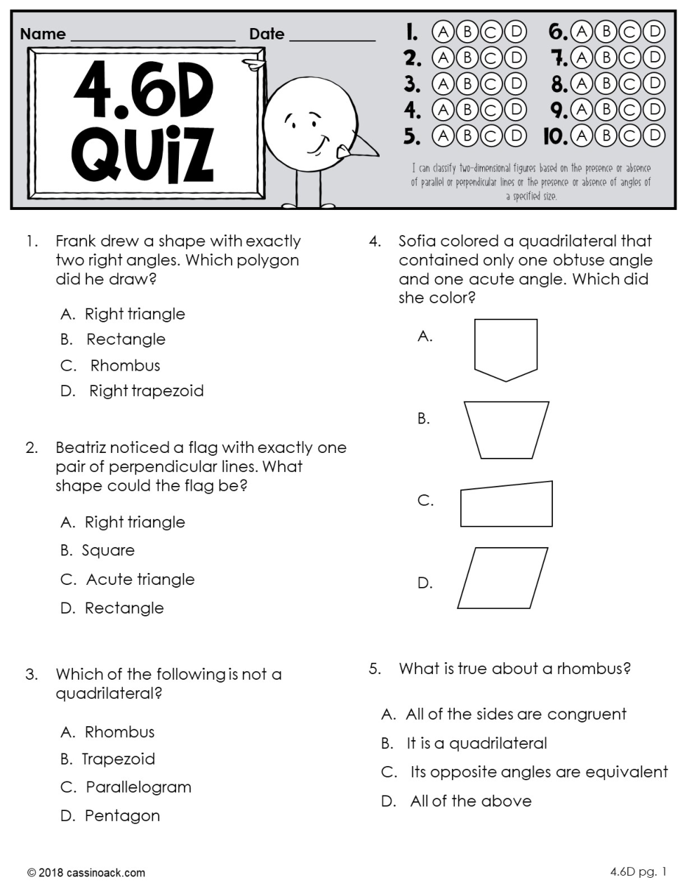 Sophia colored a quadrilateral that contained only one obtuse angle and one acute angle. Which did she color? (Look at the original quiz)