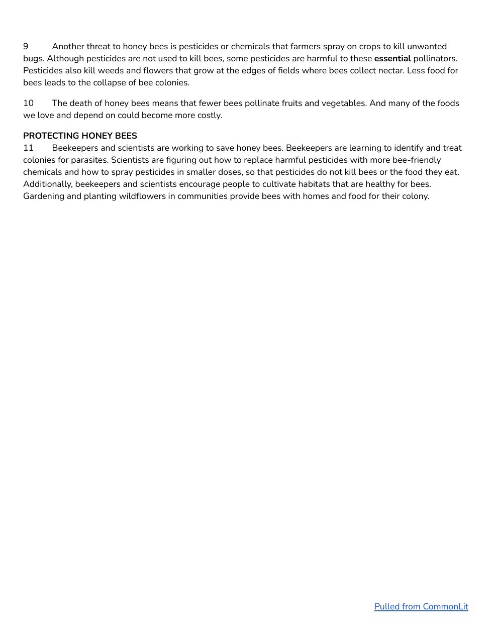 - "Pesticides also kill weeds and flowers that grow at the edges of fields where bees collect nectar..." (Paragraph 9 - What's the Buzz About Bees?)