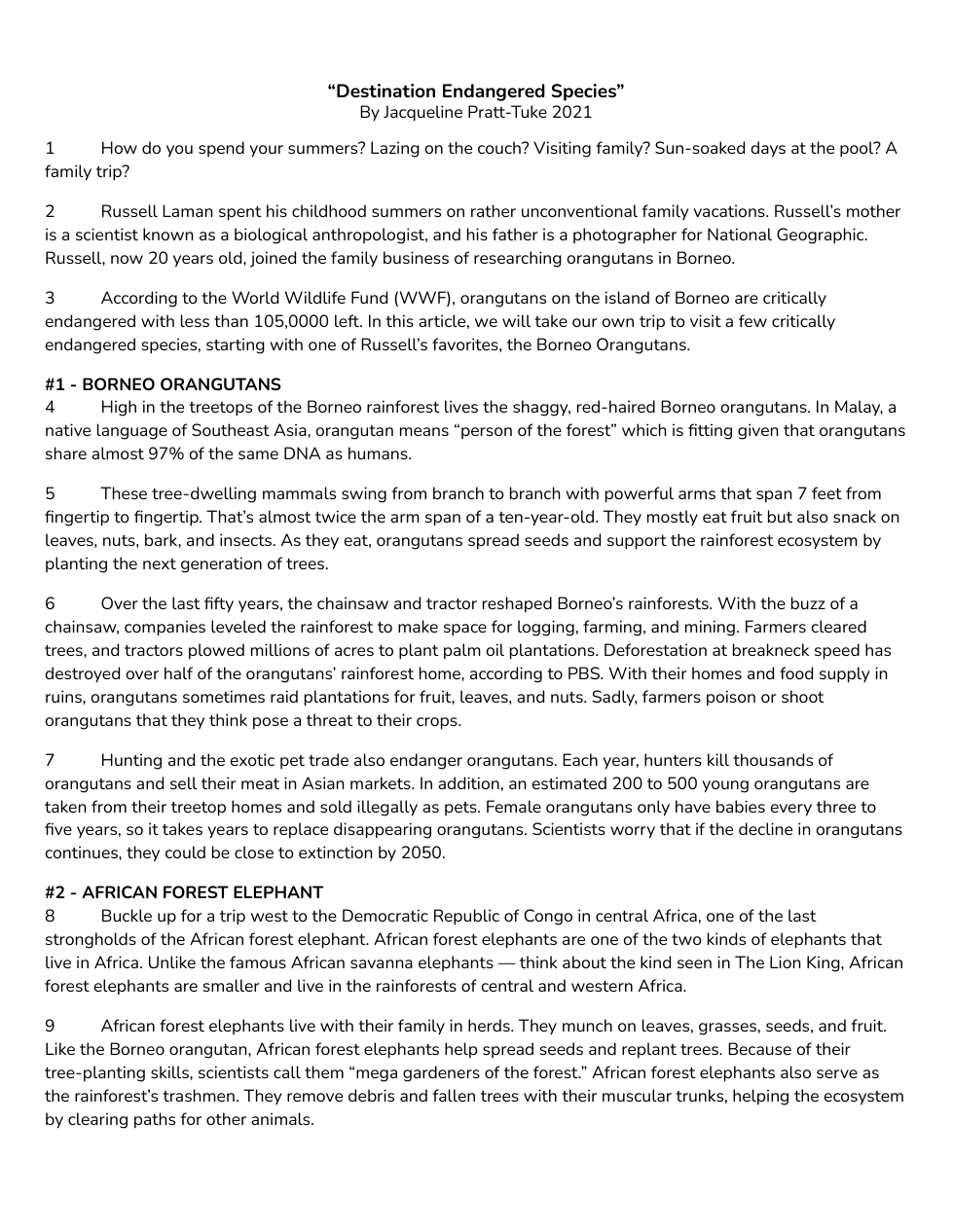 - “...orangutan means “person of the forest” which is fitting given that orangutans share almost 97% of the same DNA as humans.” (Paragraph 4 - Destination Endangered Species)