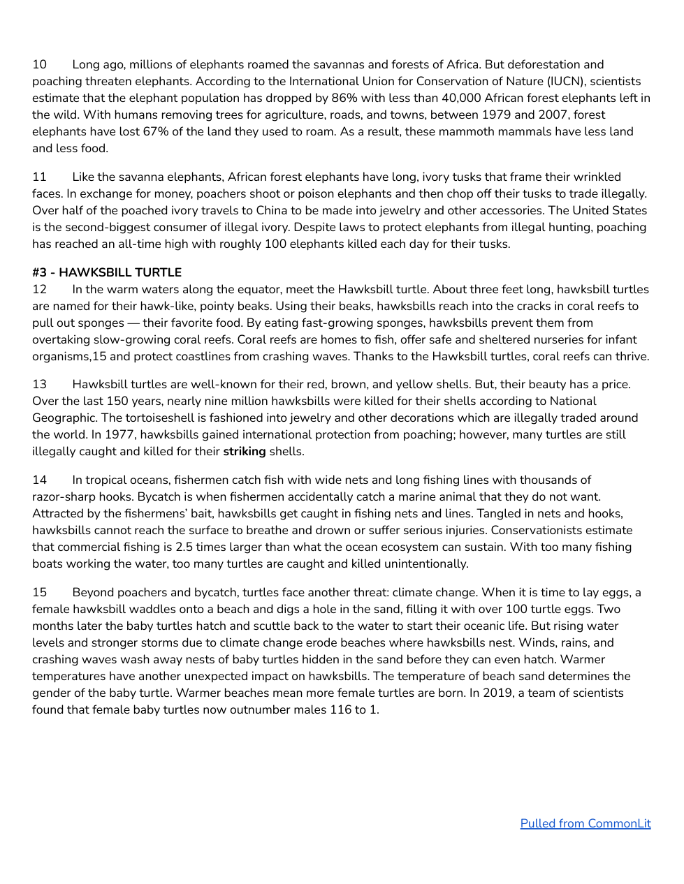 - “Warmer beaches mean more female turtles are born.” (Paragraph 15 - Destination Endangered Species)