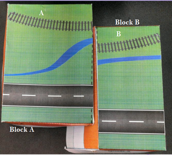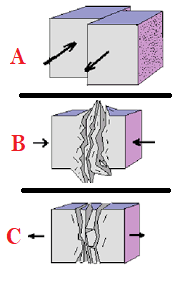 Block B did not move, draw an arrow on the block that moved, in the direction it moves.Draw a line over the fault.