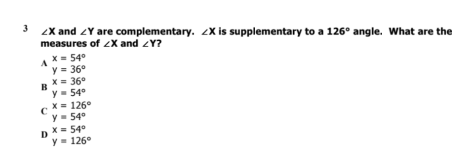<X and <Y are complementary. <X is supplementary to a 126* angle. What are the measures of <X and <Y?