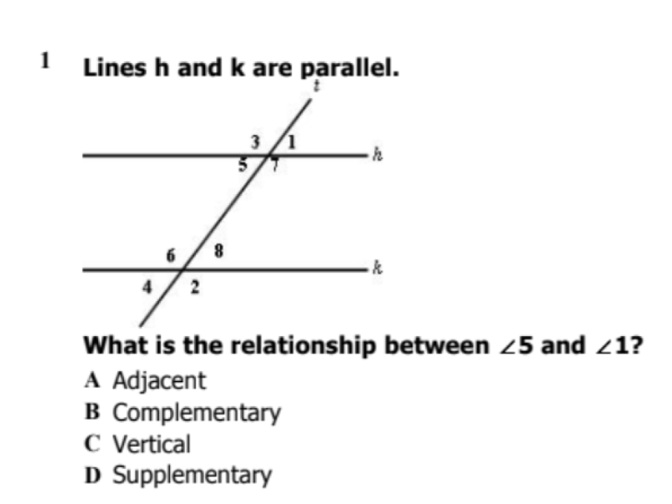 Lines h and k are parallel. What is the relationship between <5 and <1?