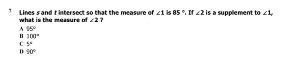 Lines "s" and "t" intersect so that the measure of <1 is 85*. If <2 is a supplement to <1 what is the measure of <2?