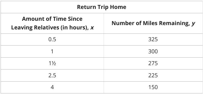Let’s consider a situation where the Williams family is coming home from visiting relatives. Mrs. Williams has to drive 350 miles in order to get home. Even though there is road construction, the family still drives at a constant rate; however, it takes them longer to drive home than it did to get to their relatives' house. Shonda Williams was bored, so she kept track of how many miles, y, remained until they got home after a certain amount of time, x, had passed. Shonda’s data appears in the table below.
