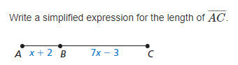 For line segment AC, Point B is in between points A and C. Write an equation in terms of x, then solve for x.