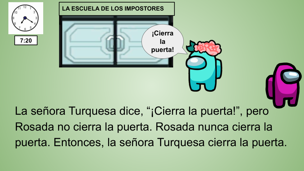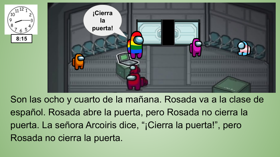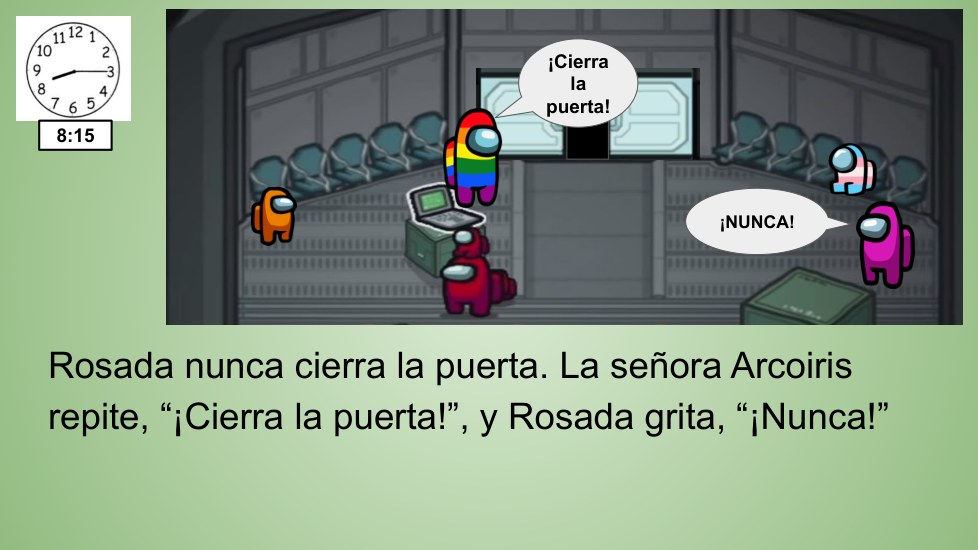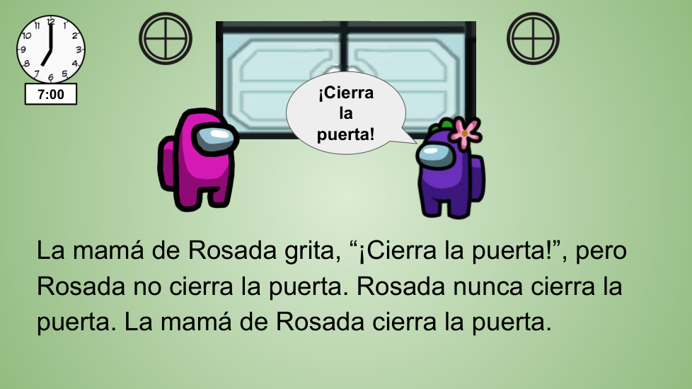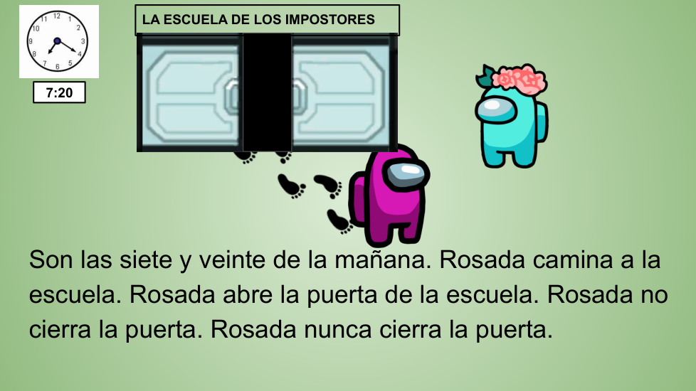 What time is it in the story? Show me where in the text you see the vocabulary that tells time in Spanish.