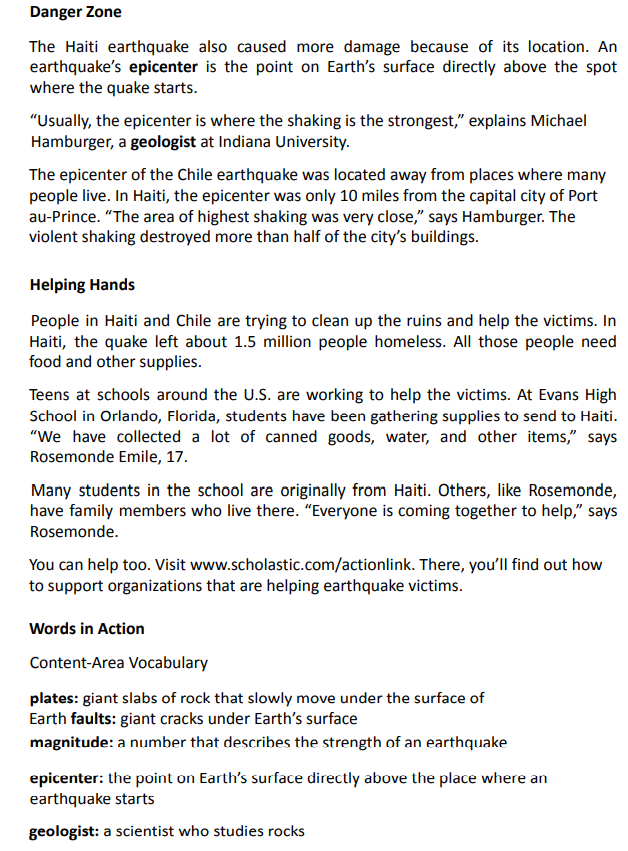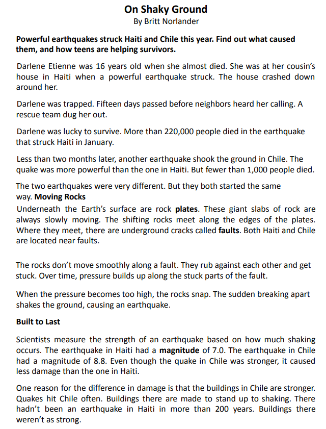 Read the article, "On Shaky Ground." Then, answer the questions below.