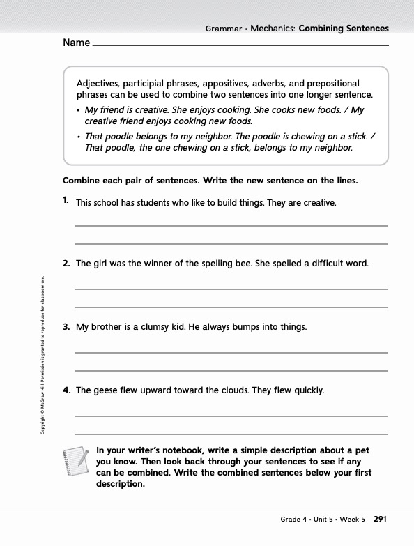 Adjectives, participial phrases, appositives, adverbs, and prepositional phrases can be used to combine two sentences into one longer sentence.