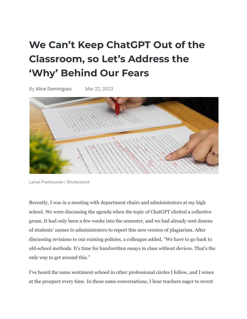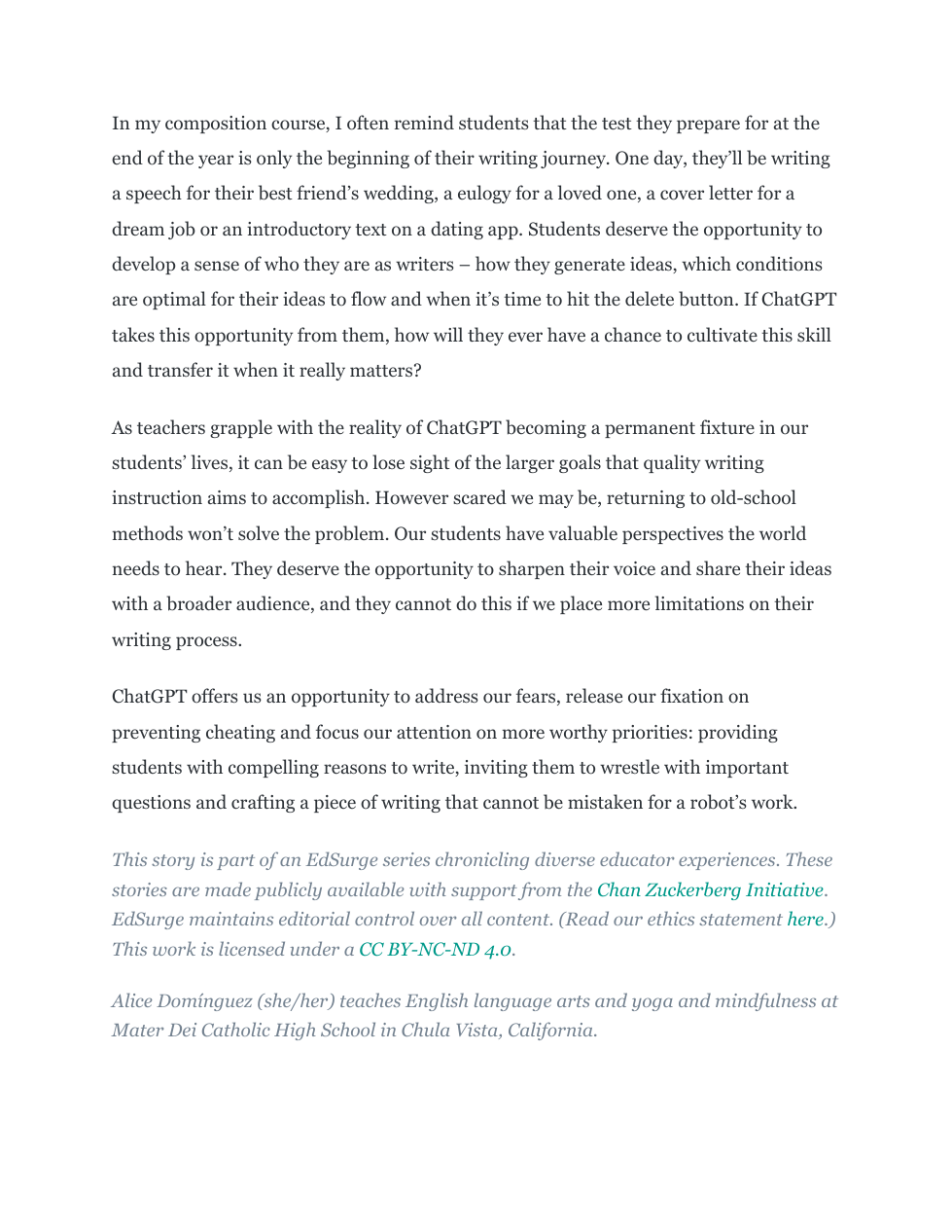 ChatGPT automates the process of gathering information and ideas which is what one would consider "surface-level" learning. If we are to focus on deep learning and the transfer of skills, it's what we ask our students to do with AI-generations that will take front and center. Discussion and collaboration may help support deeper learning, but providing students the opportunity for authentic content creation, may not only support the transfer of knowledge acquisition, but it can also foster career-readiness.