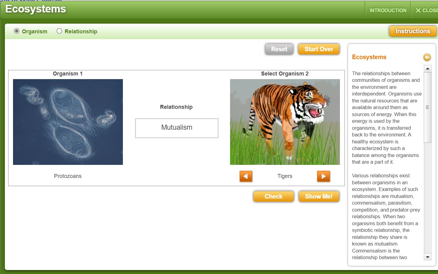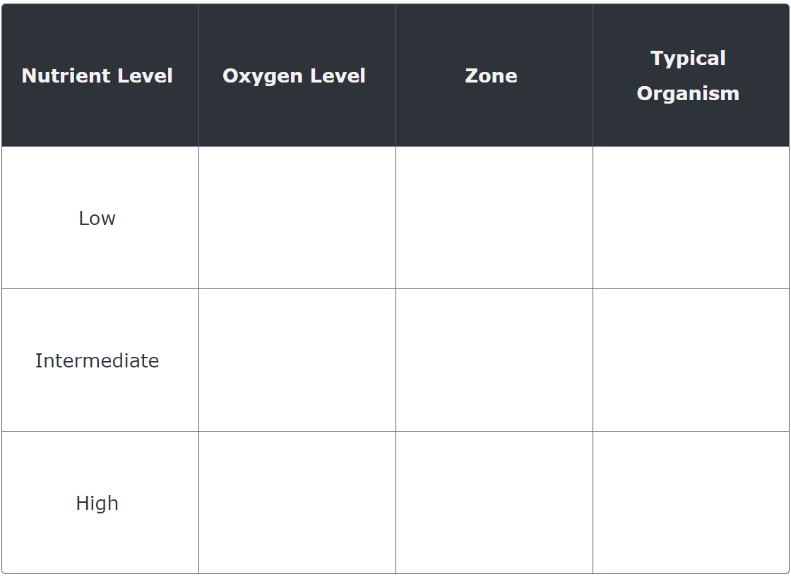 The nutrient content and oxygen levels in streams and rivers often change from one part to another. Drag and drop the tiles to match the relative oxygen levels and zones of the river to its corresponding nutrient levels. Also, place the picture of an organism that would most likely inhabit each zone.