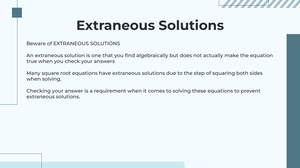 I know that extraneous solutions are a big issue, and I will check for extraneous solutions before moving on to the next problem