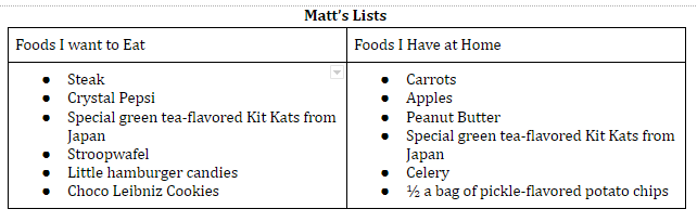 Matt needs to decide what snack he should eat next for “Snax with Matt”. But because he’s social distancing, he can’t go to the store. So, to solve the problem, he makes two lists: