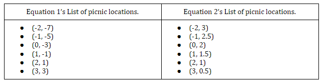 Equation 1 and Equation 2 want to find a nice place on the coordinate plane to have a picnic. But both of the equations are very picky. Each of them makes a list of places they will be willing to eat.
