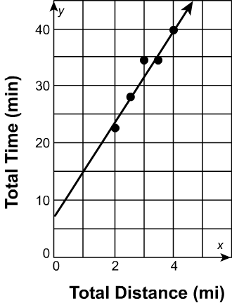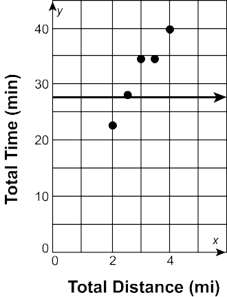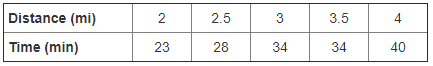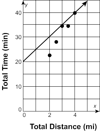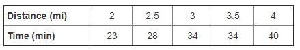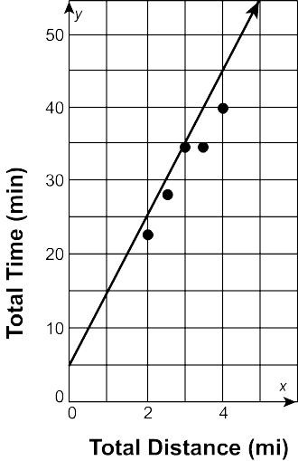 Yumiko’s exercise data is shown. Using the trend line y = 8x + 8, how many minutes will it take Yumiko to run 5 \textrm{ mi}?