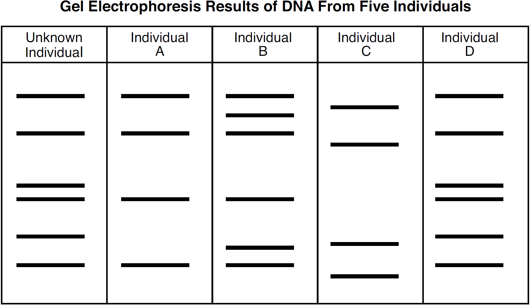 The chart represents the results of gel electrophoresis of DNA from an unknown individual and four known individuals.