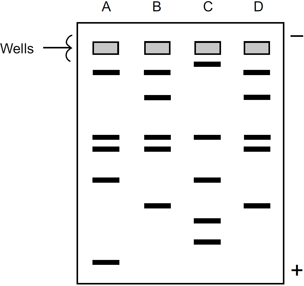 DNA samples were taken from four different species of animals labeled A, B, C, and D. The diagram below represents the results of a procedure that separated the DNA fragments from each species.