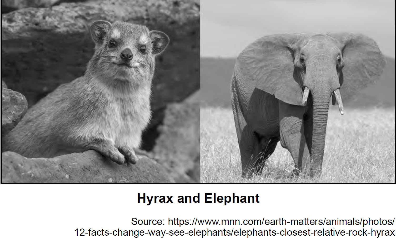 A hyrax is an animal that has been called a rock rabbit and looks like a guinea pig. Fossil records show that hyraxes first appeared on Earth approximately 37 million years ago. As they evolved, some became mouse-sized, while some were the size of a horse. Some eventually adapted to marine life and are related to manatees, and some became grazers and are related to elephants.