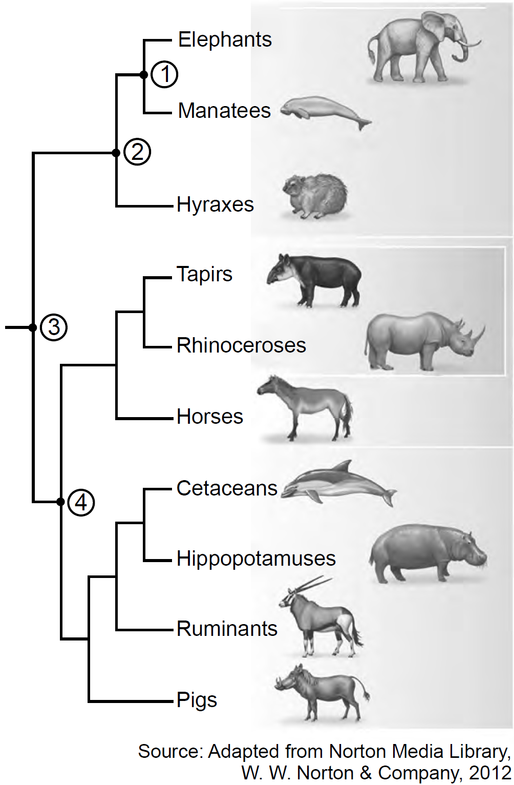 Which number would indicate the most recent common ancestor of the hyrax, elephant, and manatee on the section of this mammalian evolutionary tree?