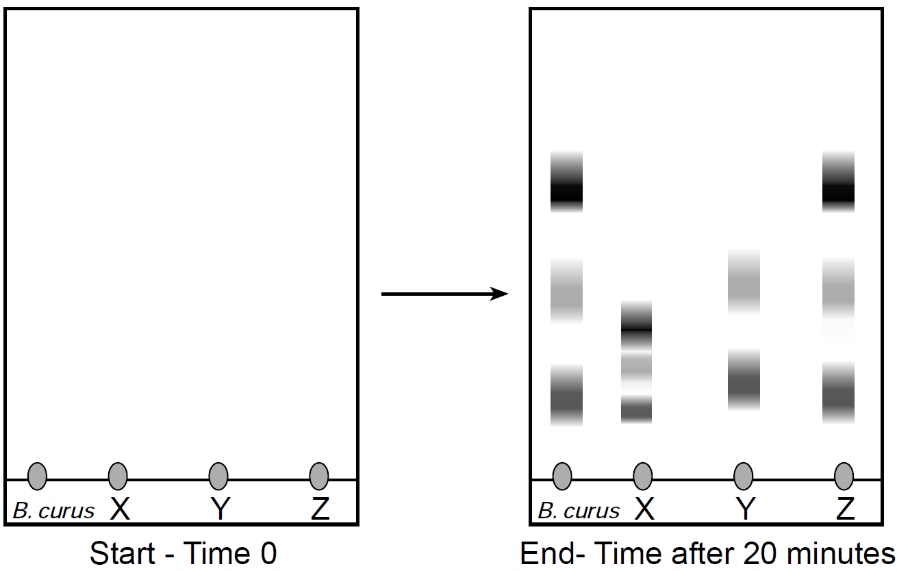During the Relationships and Biodiversity lab, simulated pigments from three plant species were compared to those in Botana curus. The results were similar to those represented below.