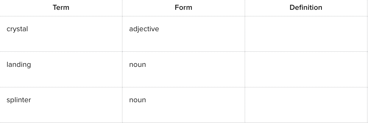 Drag and drop the definitions of the term in the definition column. Then, drag and drop the picture that represents the word in the term column.