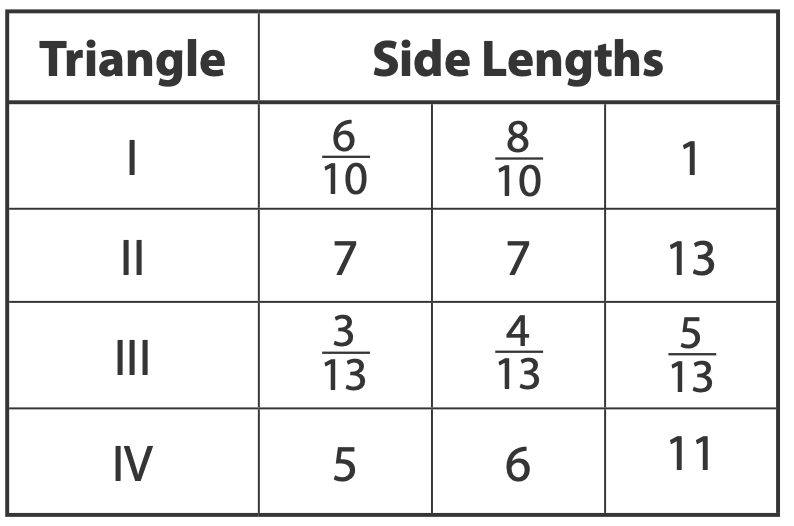 (Level 3) The side lengths of four triangles are shown in the table. Select all the triangles that are right triangles.
