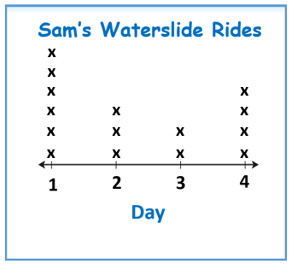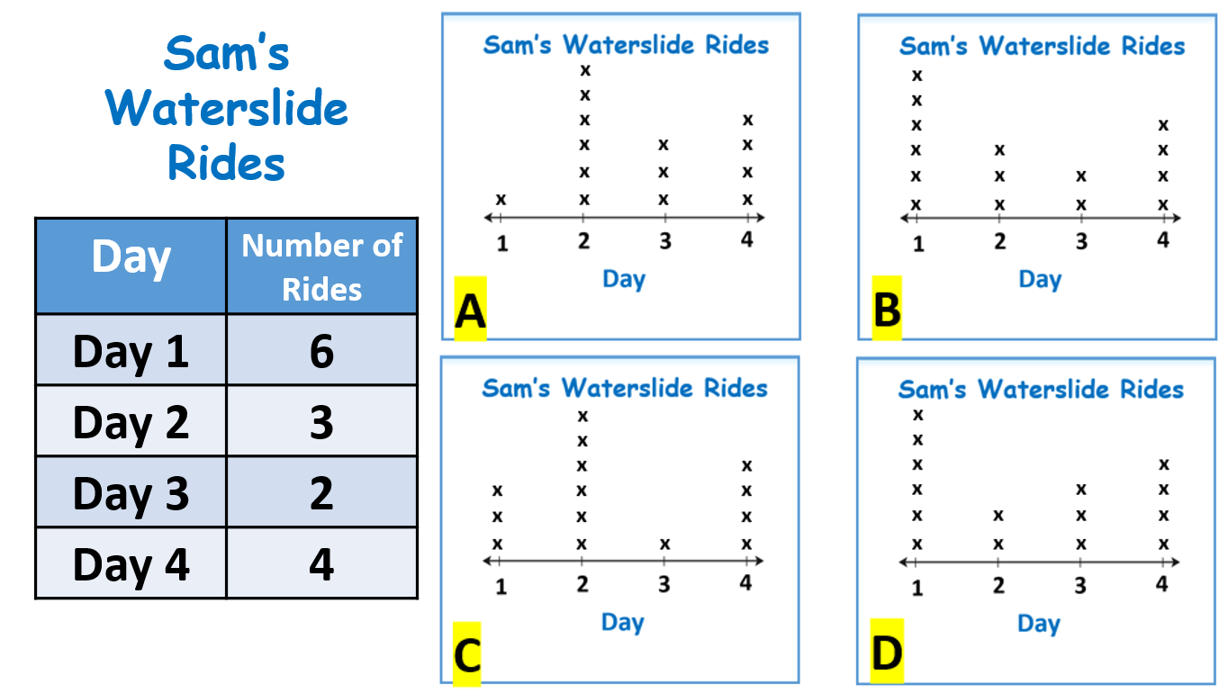 Sam visits the water park 4 days this week. Use the chart below to help you choose which line plot correctly shows how many times Sam went on a waterslide each day.