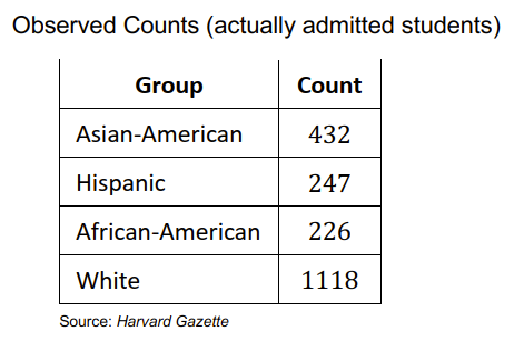 Imagine that Harvard claims: “We only accept the top academic applicants and we treat those applicants equally." We would like to test if there is convincing evidence against this claim.